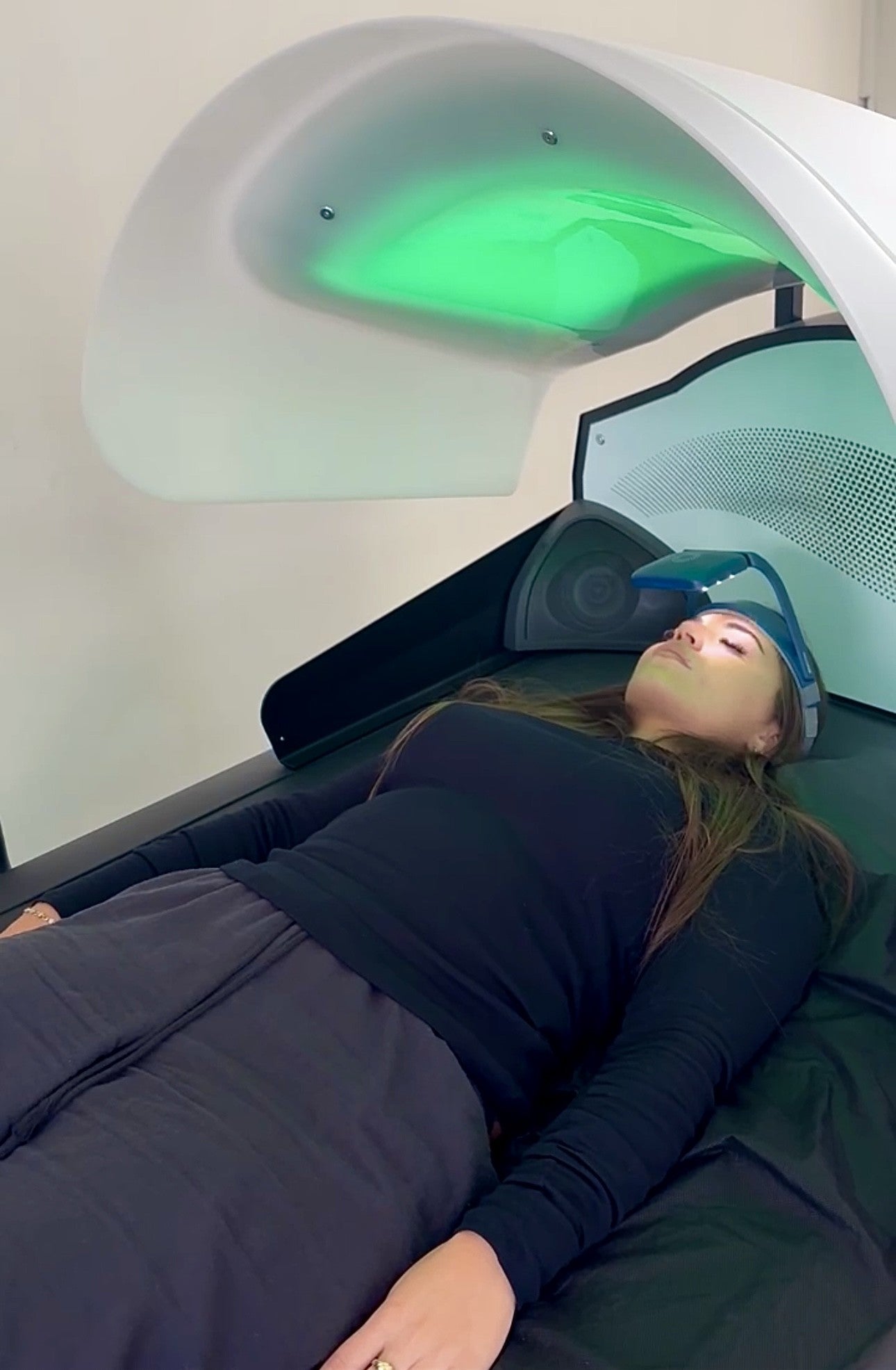 Imagine lying weightless on a warm, gently undulating dry water bed. Behind your closed eyes, a symphony of rhythmic light and sound guides your brain into effortless coherence. The mind drifts, the body releases, and nervous system balance is restored.